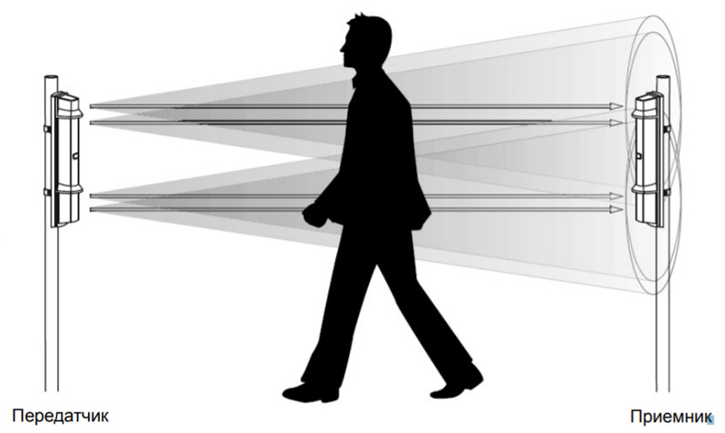 Активный извещатель состоит из источника инфракрасных лучей (передатчика) и приемника, получающего лучи. Передатчик и приемник устанавливаются на противоположных сторонах контролируемой области. Когда нарушитель пересекает лучи, приемник определяет это и отправляет тревожный сигнал на панель управления.