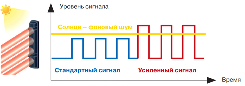 Уровень паразитного светового фона значительно повышается при засветке приемника солнечным светом при восходе или закате. В этом случае мощность сигнала передатчика автоматически увеличивается, позволяя приемнику четко дифференцировать его на фоне засветки.