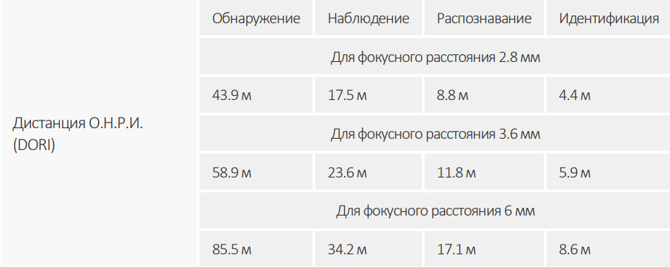 - Для фокусного расстояния 3.6 мм: 58.9 м 23.6 м 11.8 м 5.9 м