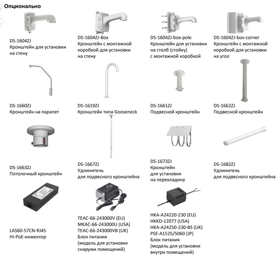 • Питание: AC 24 В, 3.0 А, 50/60 Гц (макс. 60 Вт, включая макс. 40 Вт для обогрева), Hi-PoE, от 42.5 до 57 В, 1.41 А (макс. 50 Вт, включая макс. 20 Вт для обогрева)
