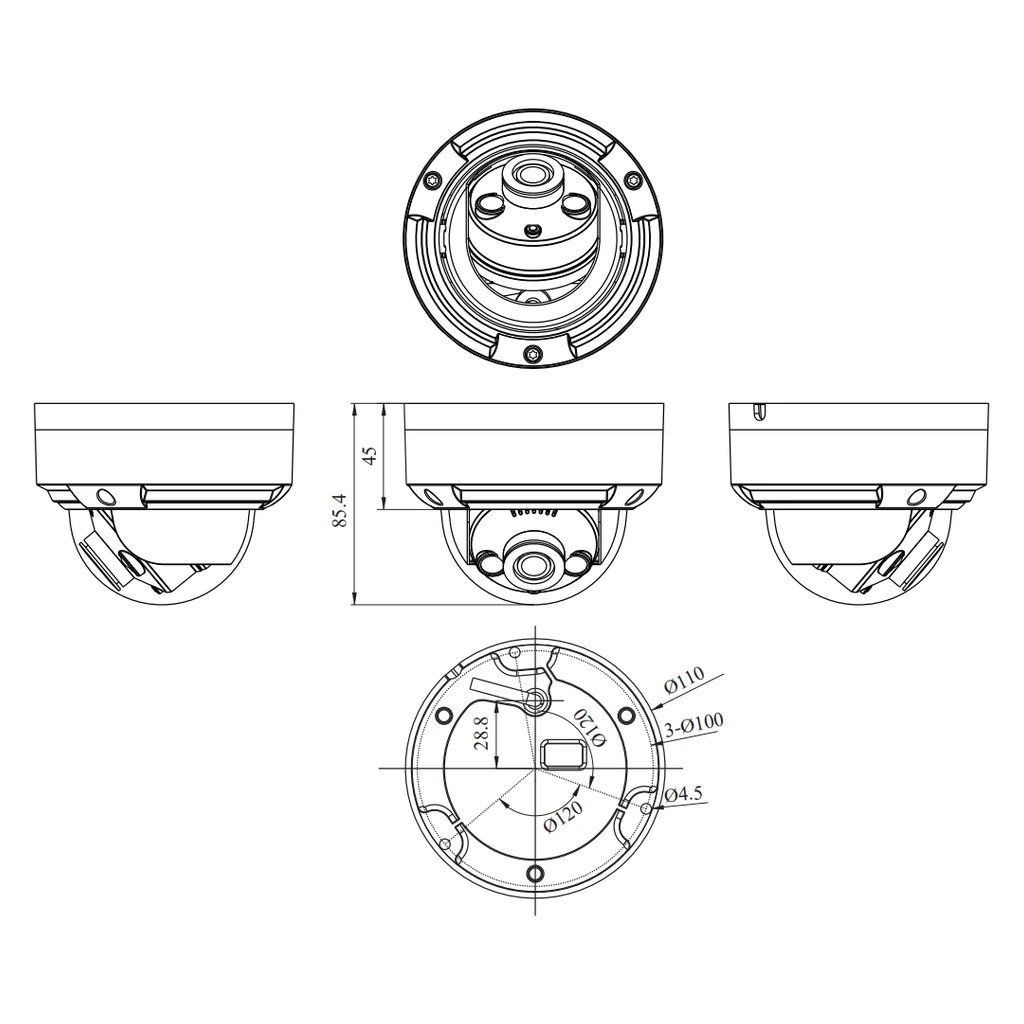 Модель оборудована фиксированным объективом с фокусным расстоянием 2,8 мм и широким углом обзора 97.4°, что позволяет охватывать большую площадь контроля. Камера поддерживает три потока видео с кодированием H.264, H.265 и MJPEG, что обеспечивает гибкость при организации хранения и передачи данных. Функции WDR 120 дБ, 2D/3D DNR, антизасветки и антифликера обеспечивают высокое качество изображения в сложных условиях освещённости.