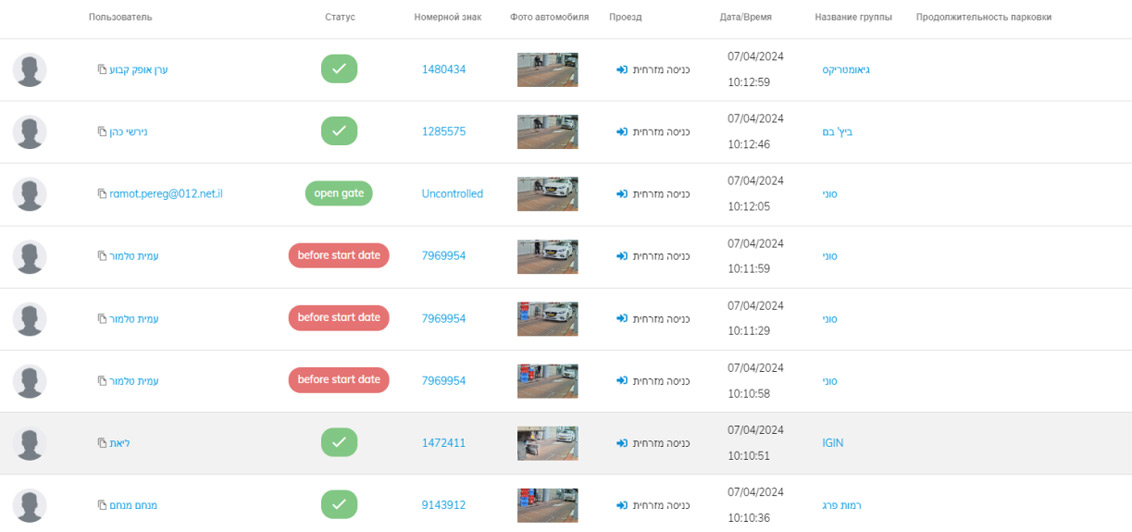Отображается номер автомобиля, пользователь, время въезда-выезда, длительность стоянки и тд.