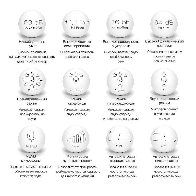 • Мультинаправленный микрофон работает в речевом диапазоне звуковых частот.