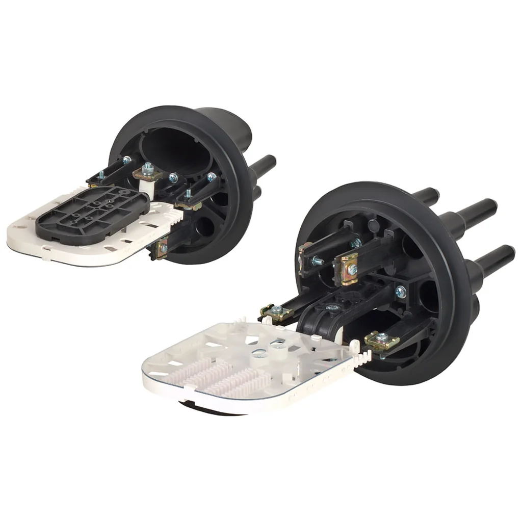 Инженеры реализовали в модели технологию ступенчатых вводов: два круглых порта до 20 мм, два до 16 мм и один овальный транзит до 25 мм, что упрощает разделку кабелей разных диаметров без дополнительных переходников. Герметизация достигается благодаря комбинированной системе «хомут + ТУТ»: наружное кольцевое зажимное устройство плотно стягивает кожух, а термоусаживаемые трубки обеспечивают надёжную влагозащиту вводов. Такая схема выдерживает давление и полностью исключает проникновение пыли, влаги и конденсата, поддерживая стабильные оптические характеристики линии на протяжении всего срока службы.