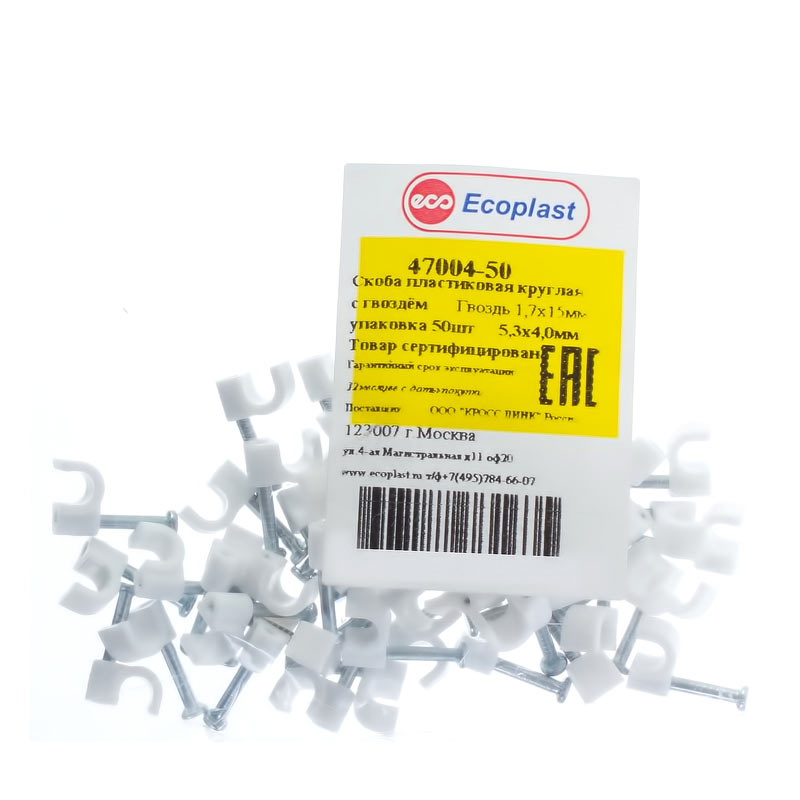 Скоба 5,3х4,0, круглая с гвоздем, 1,7х15мм 50шт – крепежный материал для фиксации электропроводки, кабеля и т.д. Скоба изготовлена из эластичного полиэтилена, надежно удерживает стальной гвоздь. Элемент устойчив к высоким нагрузкам и механическим воздействиям. Круглая форма скобы позволяет крепко зафиксировать гвоздь. А белый цвет считается нейтральным, поэтому скоба растворяется в интерьере, становится незаметной. Применить данный крепеж под силу даже непрофессиональному мастеру.
