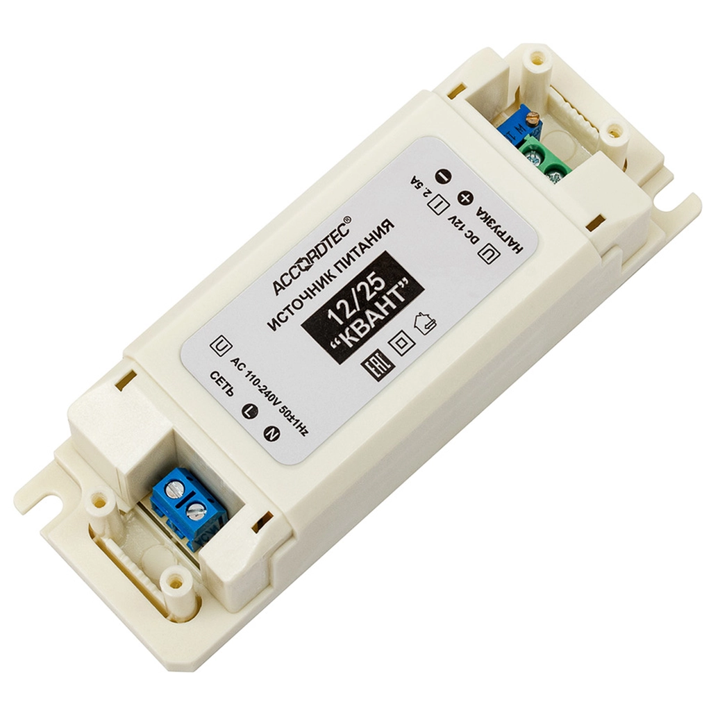 Источник стабилизированного питания AccordTec AT-12/25 КВАНТ – это надежное устройство, предназначенное для обеспечения стабильного и безопасного электропитания оборудования систем безопасности и автоматизации. Модель создана для работы в составе видеонаблюдения, СКУД, охранно-пожарных сигнализаций и систем контроля доступа. Благодаря широкому диапазону входного напряжения и встроенной функции регулировки выходного параметра, устройство гарантирует корректную работу подключенных нагрузок даже при колебаниях в сети.