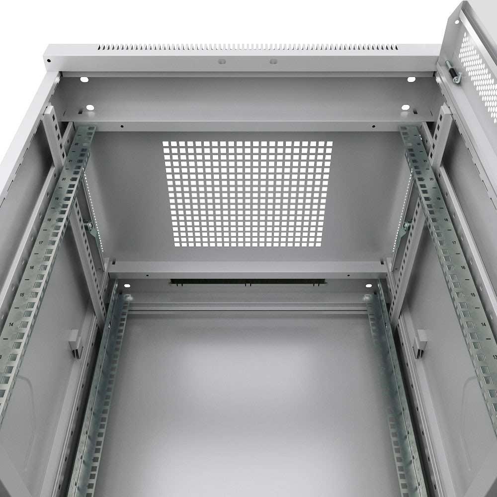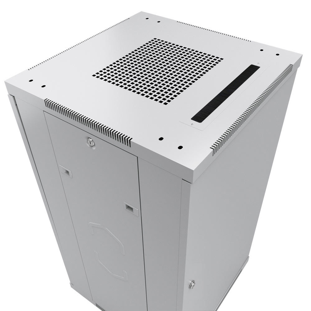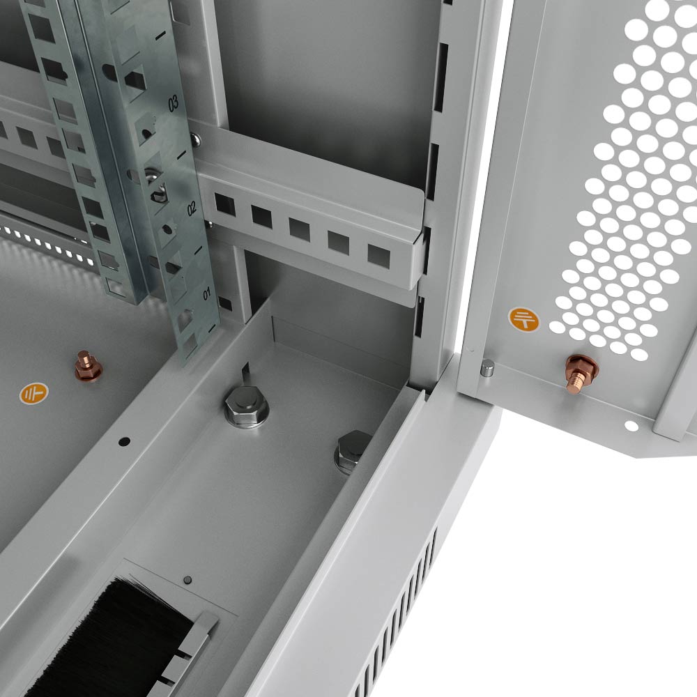 В основание шкафа и в крыше предусмотрены щеточные вводы для защиты оборудования от пыли при вводе информационного и силового кабеля. В шкафу великолепно продумана естественная (пассивная) вентиляция, за счет перфорации в корпусе шкафа и на передней дверце. А так же, конструктивно, предусмотрена установка активной вентиляции.