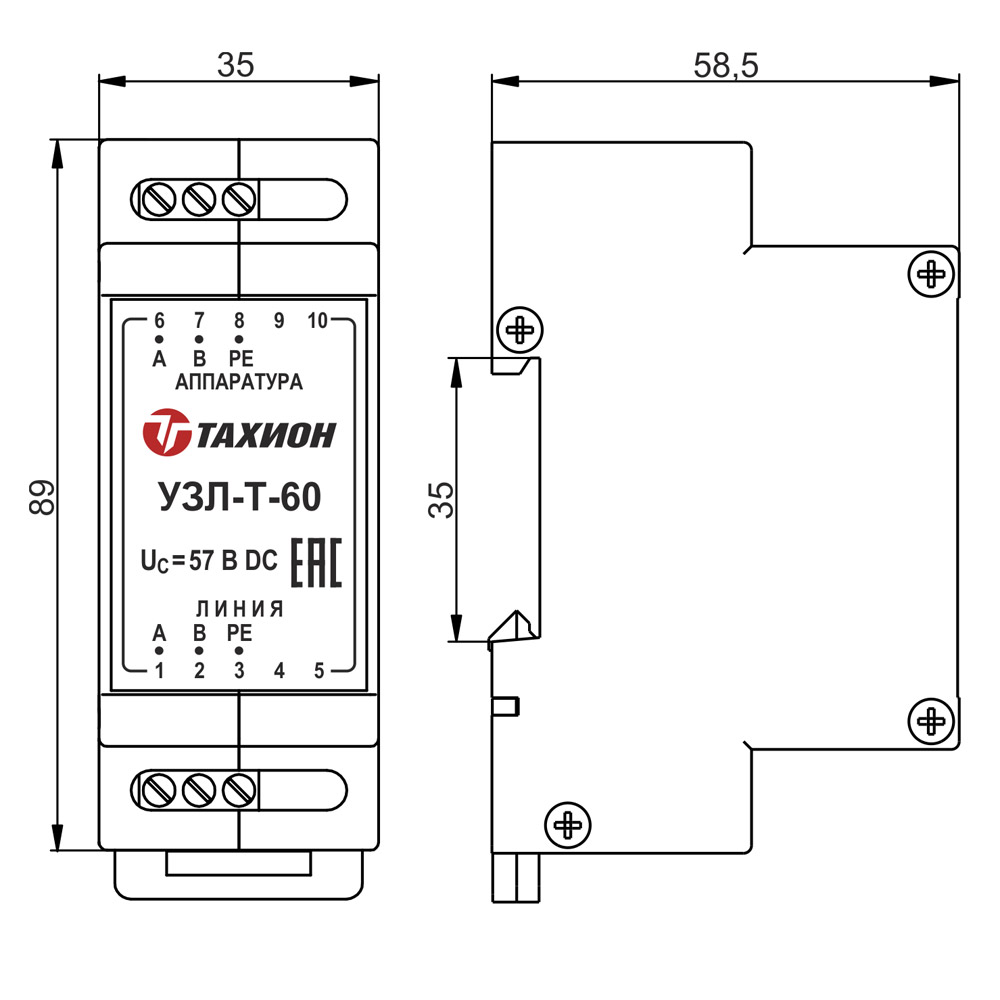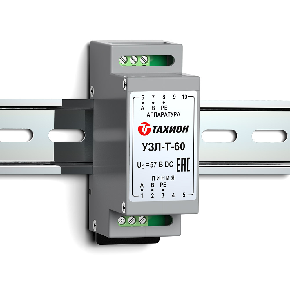 УЗЛ-Т-60 по техническим и эксплуатационным характеристикам удовлетворяет требованиям ГОСТ IEC 61643-21. Степень защиты IP20 в соответствии с ГОСТ 14254. Конструктивно УЗЛ-Т-60 выполнено в пластмассовом корпусе с креплением на 35мм DIN-рейку. Выпускается по техническим условиям ТУ 26.30.50-077-31006686-2017.