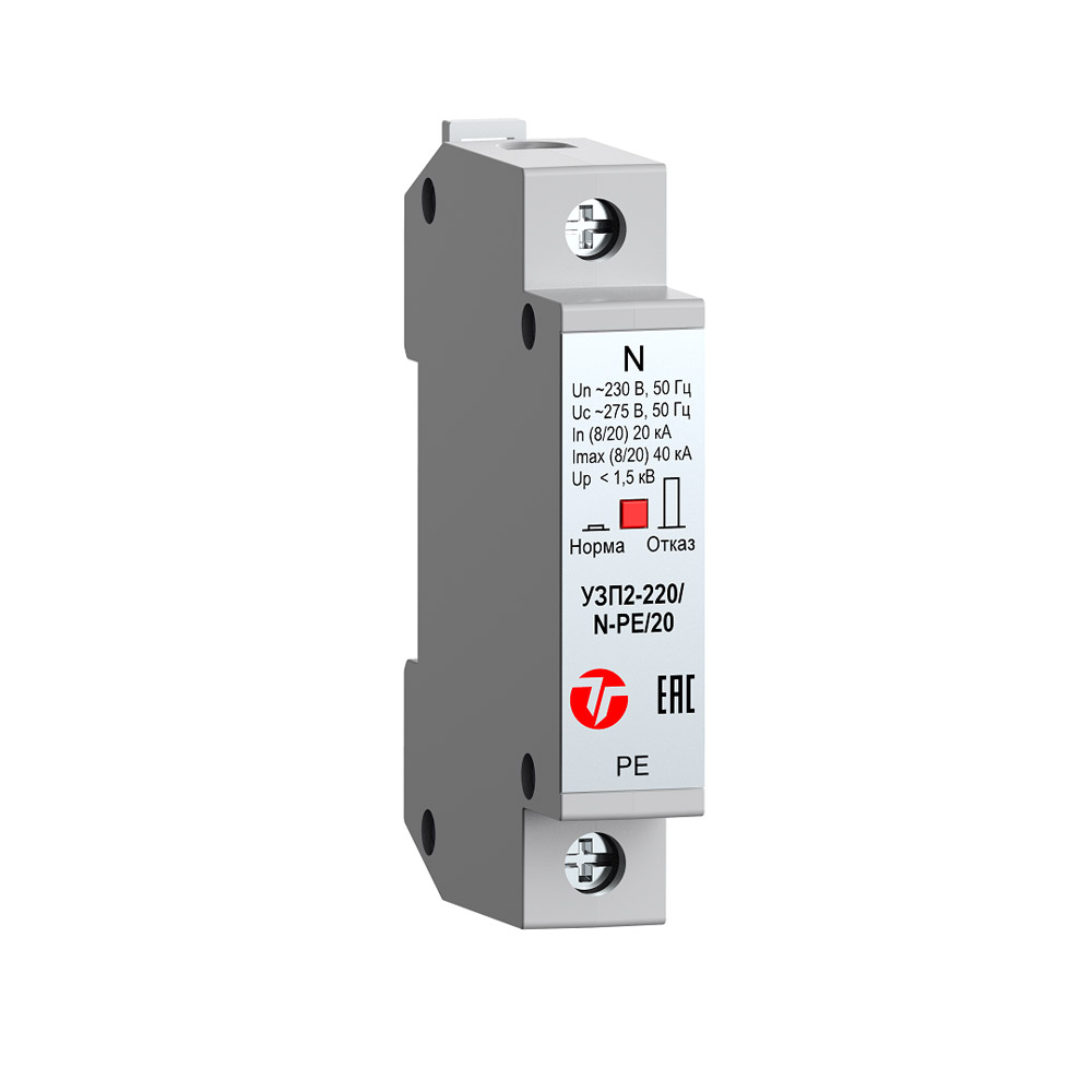 УЗП2-220/N-PE/20 – однополюсное устройство защиты ограничительного типа класса испытаний II, по техническим и эксплуатационным характеристикам удовлетворяющее требованиям ГОСТ IEC 61643-11, ГОСТ 30011.1, ГОСТ Р 50571-4-44, ГОСТ Р 50571.5.53.