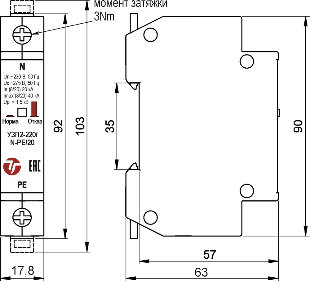 УЗП2-220/N-PE/20 имеет механический индикатор состояния отказа, при срабатывании которого устройство необходимо заменить.