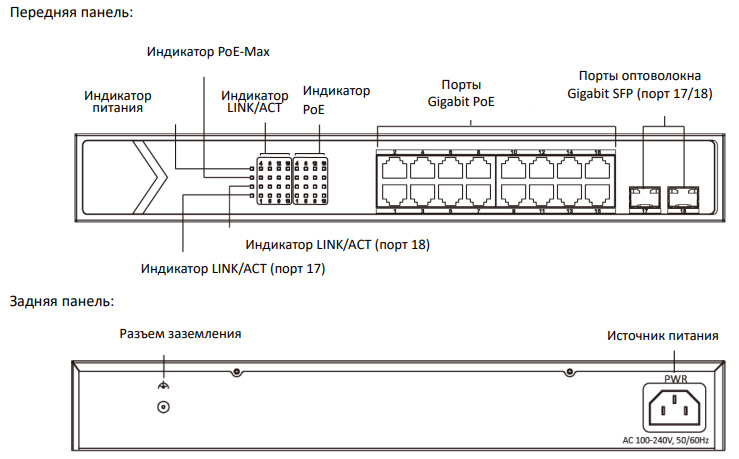 • Количество портов: 16 × Gigabit PoE-портов, 2 × Gigabit SFP оптоволоконных порта.