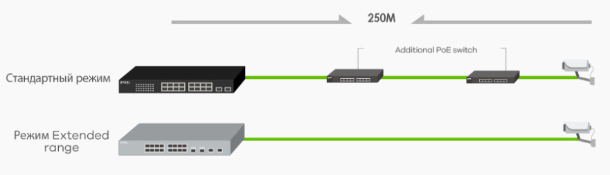 Обычные PoE-коммутаторы способны обеспечить питание и передачу данных на расстоянии не более 100 метров. Коммутаторы серии GS1350 позволяют установить IP-камеры и другие устройства с питанием по PoE в удаленных местах, используя имеющийся кабель Cat 5e. Применение в этих коммутаторах режима Extended range позволяет увеличить максимальное расстояние до запитываемых устройство до 250 метров. Вы экономите деньги рабочее время - вам не надо покупать и устанавливать дополнительные PoE-коммутаторы!