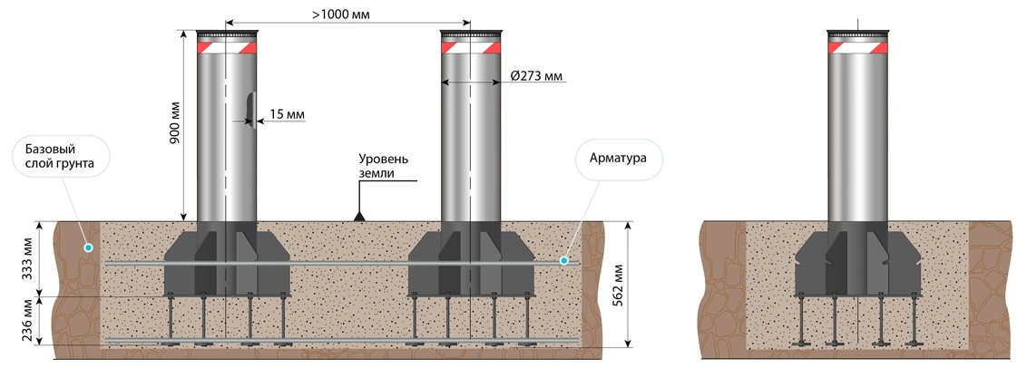 - Простота конструкции: не содержат подвижных элементов и не требуют подключения к системам управления. Монтаж — заливка бетоном, без дополнительных креплений.