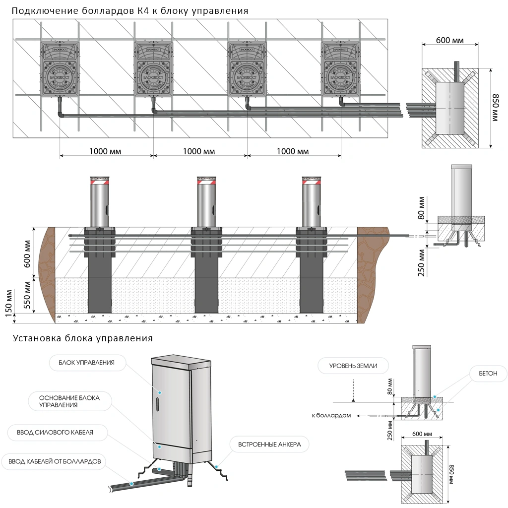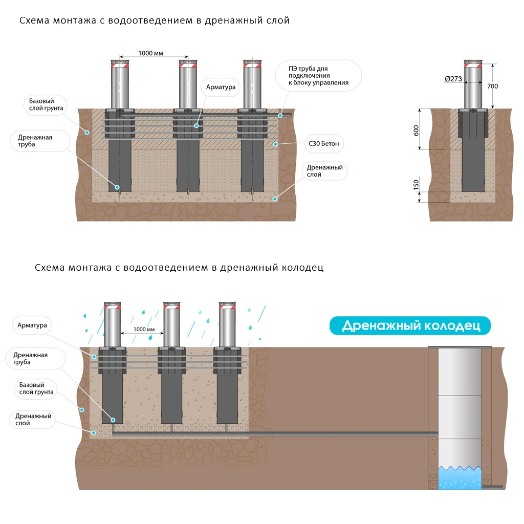 - Оптимальный уровень защиты и масштабирование — в зависимости от расчетной нагрузки на въездную группу устанавливается от 1 до 4 боллардов. Возможно расширение до требуемого количества при помощи дополнительных блоков согласования.