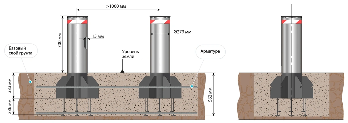 - Простота конструкции: не содержат подвижных элементов и не требуют подключения к системам управления. Монтаж — заливка бетоном, без дополнительных креплений.