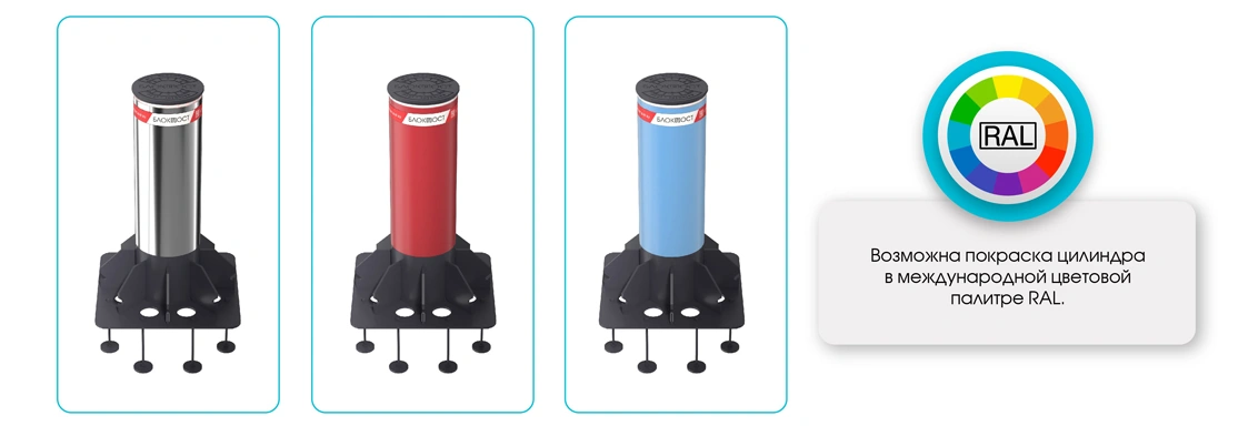 Корпус цилиндра изготовлен из нержавеющей стали толщиной не менее 10 мм, что обеспечивает устойчивость к коррозии, атмосферным воздействиям и механическим нагрузкам. Верхняя крышка и основание выполнены из окрашенного антикоррозийного чугуна. Благодаря этим материалам боллард сохраняет функциональность и внешний вид даже при эксплуатации в условиях постоянной влажности, перепадов температур и дорожных реагентов. Красная светодиодная подсветка делает устройство хорошо заметным в темное время суток и повышает безопасность движения.