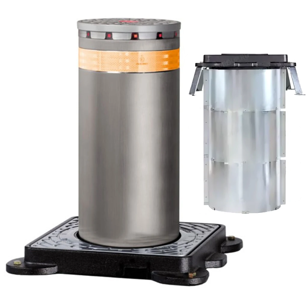 INOX-исполнение болларда использует цилиндр из нержавеющей стали AISI 316L с сатинированной поверхностью. Такой материал устойчив к коррозии, атмосферным воздействиям и реагентам, поэтому комплект подходит для эксплуатации в сложных климатических условиях и вблизи проезжей части. Блокировка столба в опущенном положении предотвращает случайный съём устройства, а подъём и опускание осуществляются с помощью специального механического ключа, что повышает безопасность и упрощает работу персонала.