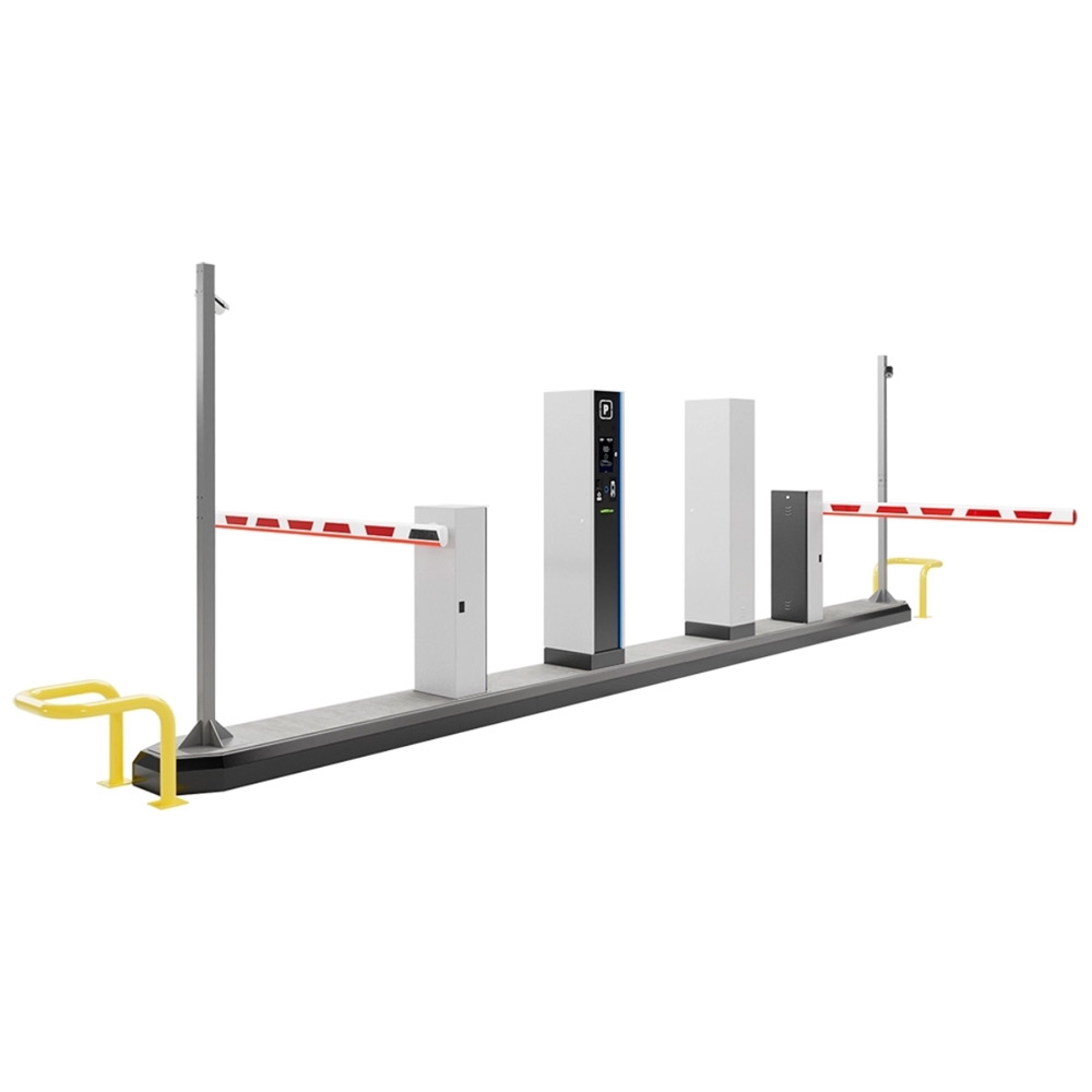 Кронштейн выезда крепится на торцевом элементе, через 1,5 метра устанавливается шлагбаум выезда, через 1,5 метра – стойка въезда, через 10 см – стойка выезда, через 1,5 метра – шлагбаум въезда, через 1,5 метра – кронштейн въезда.