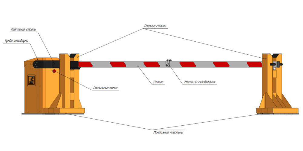 Стрела выполнена из стальной профильной трубы 120х60 мм с тросом внутри и со светоотражателями длиной 6,5 м.