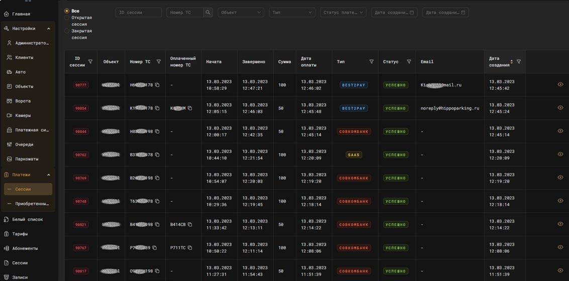 Веб-приложение CRM для управления конфигурацией объекта и мониторинга парковочных сессий - https://app.hippoparking.ru/main