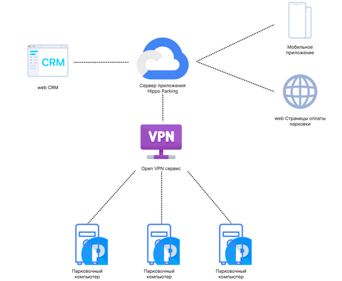 • Веб-приложение CRM для управления конфигурацией объекта и мониторинга парковочных сессий;