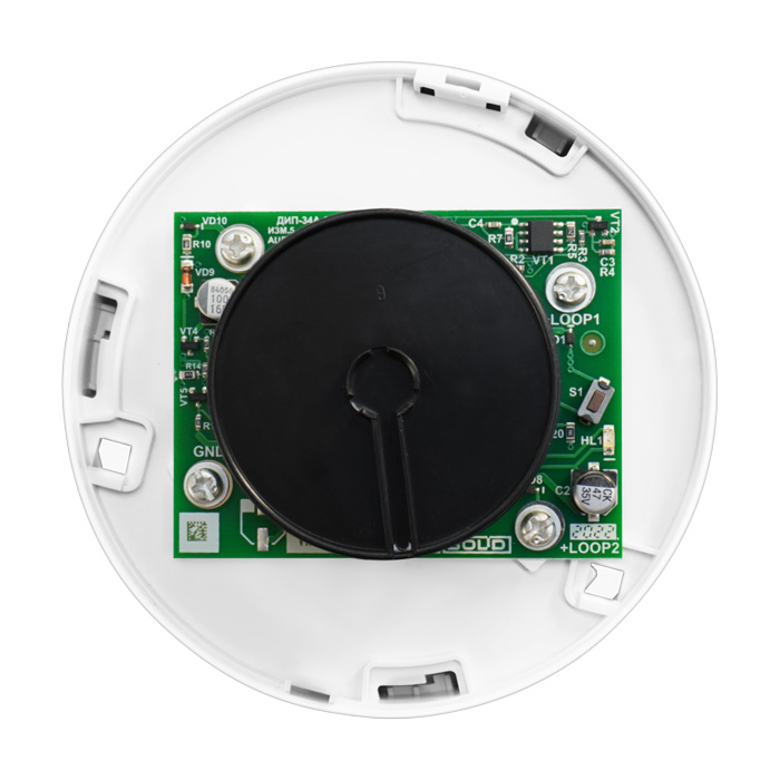 Извещатель надежно реагирует на изменения уровня задымленности за счёт встроенного микроконтроллера, который автоматически корректирует фоновые показатели, вызванные накоплением пыли, и своевременно подаёт тревожное сообщение.