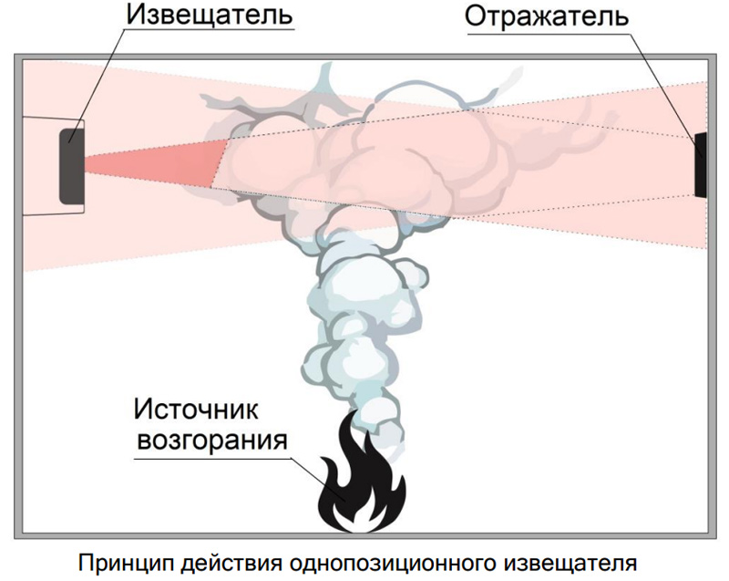 Сигнал от излучателя проходит через контролируемую среду, отражается от отражателя и фиксируется приемником. При возгорании дым от очага возгорания поднимается к потолку, и задымленная среда вызывает затухание оптического луча. В приемнике уровень ослабленного сигнала сравнивается с уровнем сигнала, полученным при настройке и принятым за сигнал, соответствующий оптически чистой среде. Как только отношение достигает установленного порога, формируется сигнал «Пожар», который по линии АЛС транслируется на ППКОПУ.
