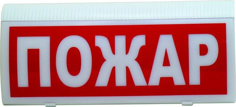 При пожаре оповещатель подсвечивает табло с надписью «ПОЖАР» мигающим белым светом, информируя окружающих о произошедшем возгорании и необходимости покинуть помещение.
