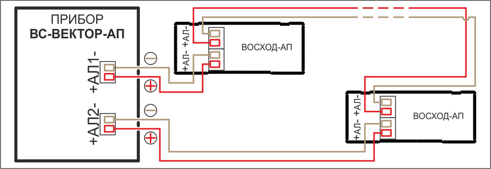 - К адресной линии прибора «ВС-ВЕКТОР-АП250» может быть подключено до 200 оповещателей «ВОСХОД-АП».
