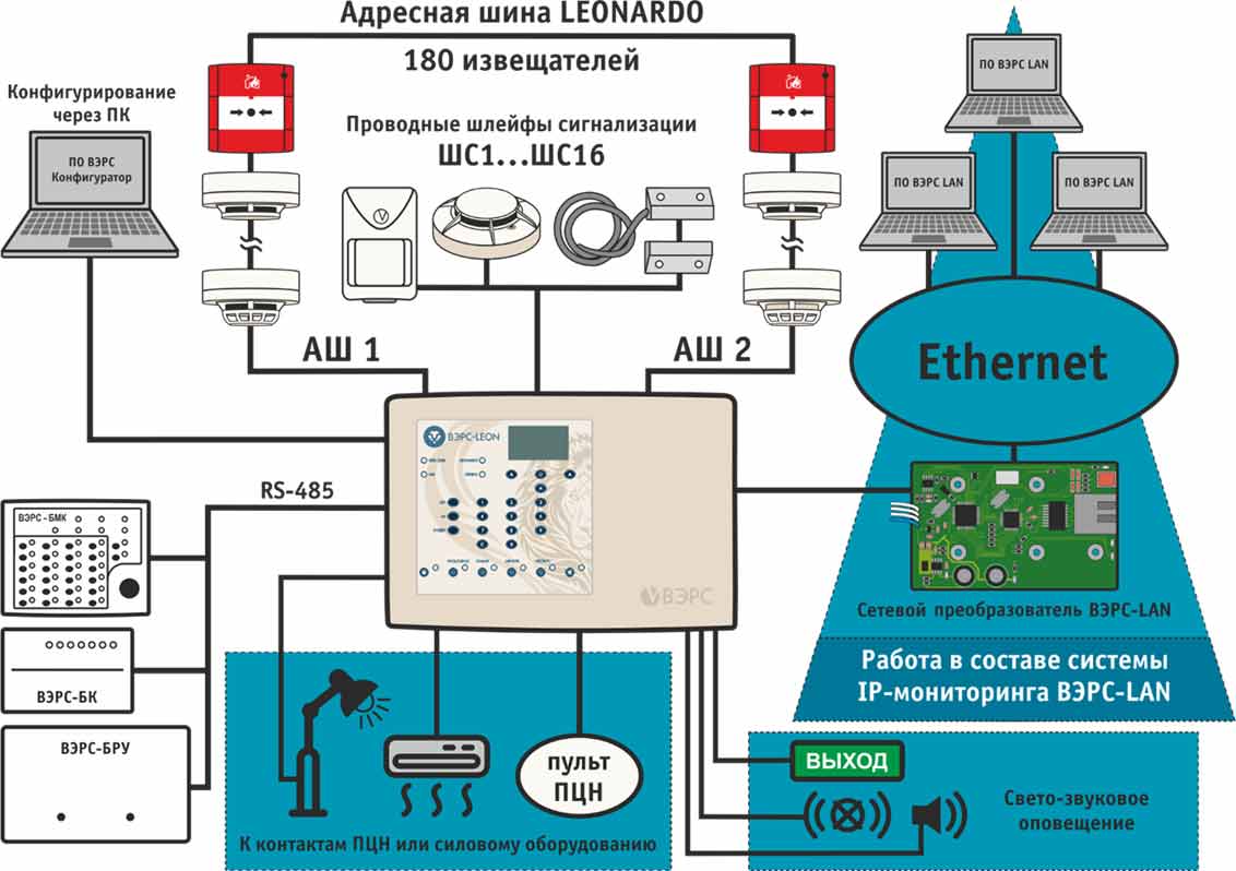 Прибор охранно-пожарной сигнализации ВЭРС-LEON — это современный адресный приемно-контрольный прибор, предназначенный для построения комплексных систем охранно-пожарной сигнализации на объектах любого масштаба. Он сочетает в себе гибкость настройки, высокую надежность и простоту эксплуатации. Благодаря поддержке как аналоговых шлейфов сигнализации, так и адресной линии LEONARDO, ВЭРС-LEON позволяет реализовать широкий спектр сценариев обнаружения, оповещения и управления.