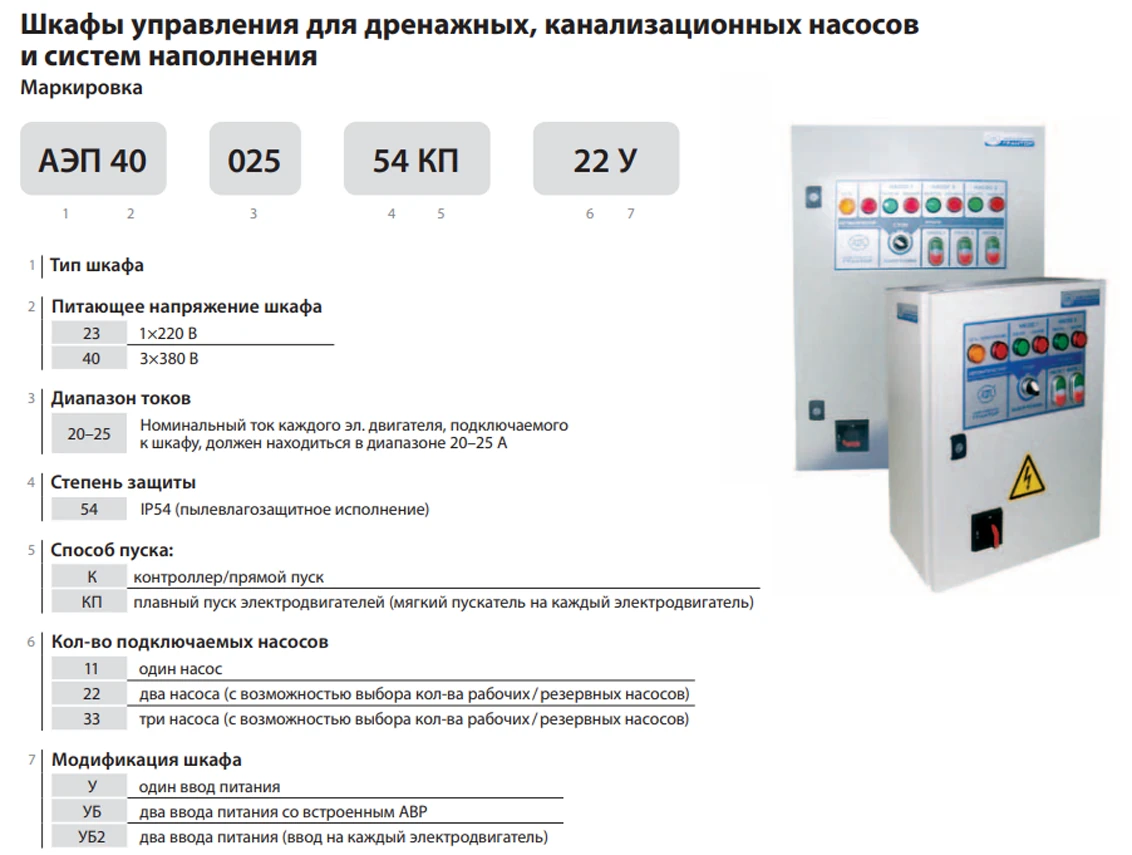 Исполнение «КП» предусматривает использование плавного пуска электродвигателей. В модификации АЭП40-001-54КП-33У применяется мягкий пускатель Grancontrol 3V40 (для мощностей до 11 кВт), который снижает кратность пускового тока до 2–3 от номинального, уменьшает гидравлические удары, снижает механические нагрузки на насос и трубопровод, исключает перегрев обмоток и увеличивает срок службы оборудования. Данный тип пуска особенно эффективен в системах, где насосы работают с частыми циклами включения.