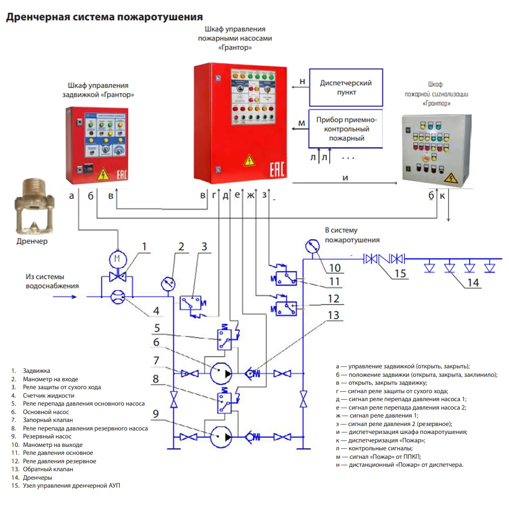 - Выходные сигналы (диспетчеризация и управление задвижкой): «Работа/Авария» каждого насоса, питание на каждом вводе, режим «Пожар», «Общая неисправность», режим «Блокировка/Автоматика отключена», управление задвижкой «Открыть/Закрыть»