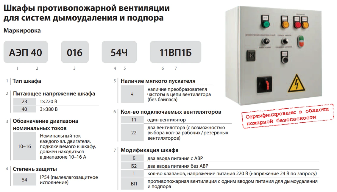 Модель АЭП40-006-54-11ВП1 относится к группе шкафов с прямым пуском и подключением одного клапана 220 В. При сохранении общей функциональности вся группа отличается только токовыми диапазонами и габаритами, что позволяет точно подобрать устройство под конкретный тип вентилятора. Шкаф поддерживает проверку цепей, передачу состояния клапана и двигателя, а также обеспечивает корректную последовательность: закрытие клапана, открытие, задержка, затем пуск вентилятора.
