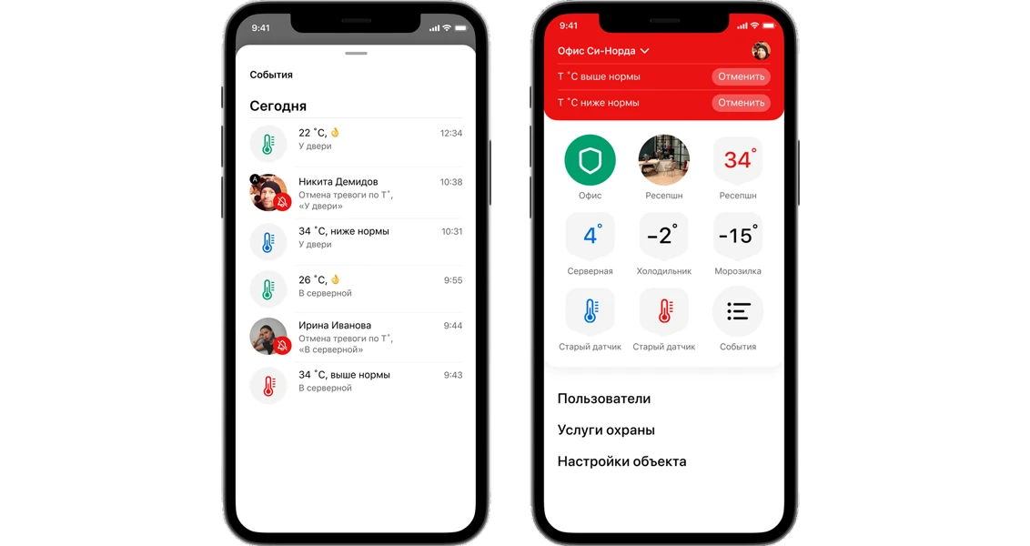 - Уведомления о превышении или понижении температуры на объекте относительно пороговых значений.
