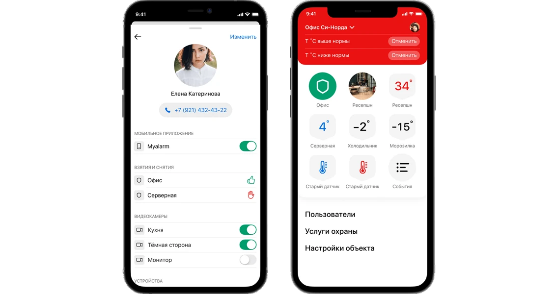 В настройках пользователя клиент видит фото пользователя, фамилию, имя, телефон, использование MyAlarm, какие помещения охраняются, какие видеокамеры и какие устройства активны.