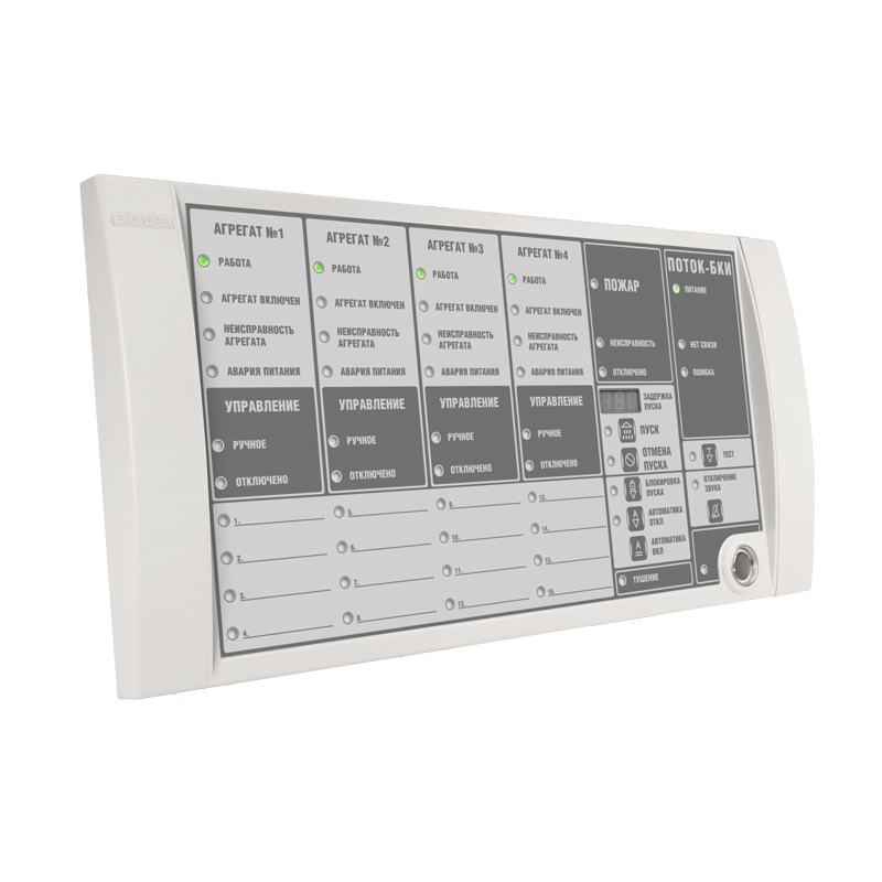 - Отображение на 24-х двухцветных индикаторах состояния 4-х пожарных агрегатов ("Работа", "Агрегат включен", "Неисправность агрегата", "Авария питания", "Ручное управление", "Управление отключено" по каждому агрегату)
