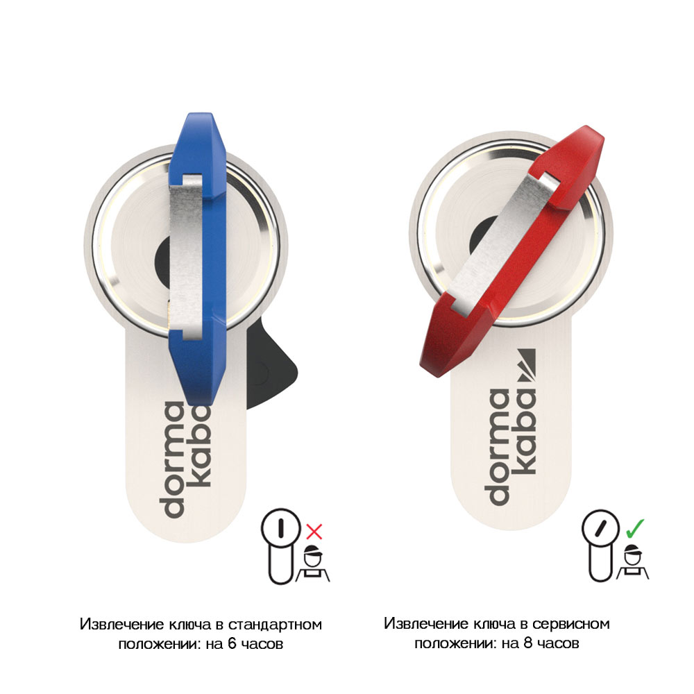 При предоставлении временного доступа владелец извлекает ключ в служебном положении (на 8 часов). В этом положении служебный ключ может открывать и запирать дверной замок снаружи и изнутри двери. Это обеспечивает безопасность двери, пока обслуживающий персонал находится в вашем помещении. Когда обслуживающий персонал завершит свою работу, дверь снова надежно запирается снаружи.