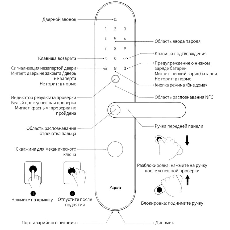 • Способы открытия: Отпечаток пальца, пароль, временный пароль, механический ключ, Bluetooth, NFC, HomeKit, ключ Apple home, удаленная разблокировка, периодический пароль, Google Assistant