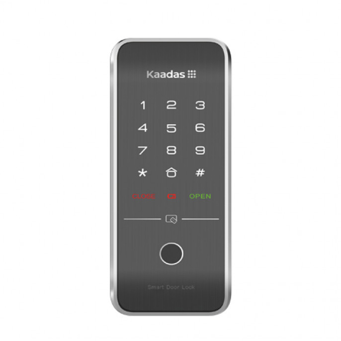 Перед вами биометрический электронный дверной замок Kaadas R6-5. Устройство имеет стильный дизайн и больше напоминает смартфон, нежели замок. Выглядит очень эффектно и аккуратно. Основной цвет черный с серебристой окантовкой.