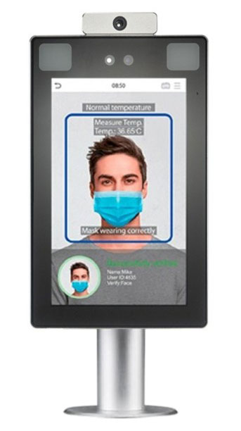 Измеряет температуру тела человека с точностью ±0.3°C, детектирует на лице маску, поддерживает идентификацию по геометрии лица и ладони.