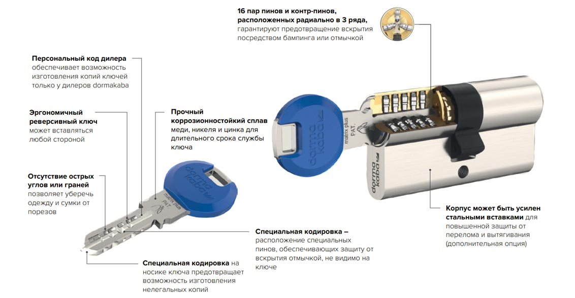 Система с реверсивным профилем ключа matrix plus от dormakaba отвечает всем необходимым требованиям к безопасности. Кроме того, возможность изготовления копий ключей есть только у авторизованных сервисных центров.