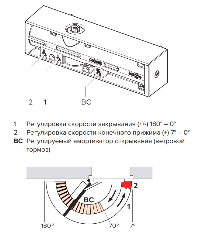 • Регулировка скорости закрывания с помощью клапана: 180°–0° ;
