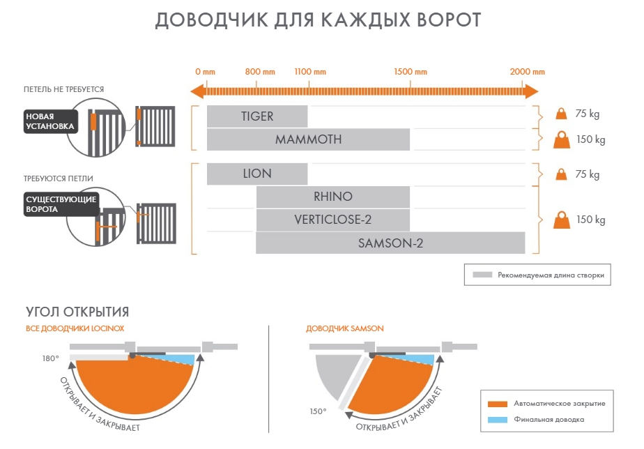 Доводчики Locinox работают на основе механической пружины и запатентованного гидравлического демпфера, благодаря которому доводчик не чувствителен к перепадам температур и идеально работает круглый год. Как силу, так и скорость закрытия можно отрегулировать, а также имеется возможность настроить финальную доводку.