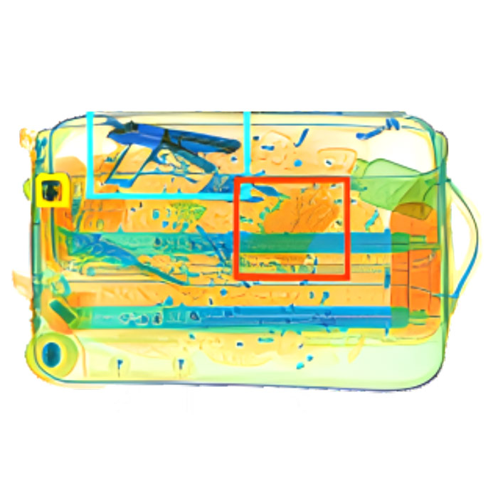 - Автоматическое выделение подозрительных объектов (наркотики, взрывчатка): используемые в ПО алгоритмы автоматически выделяют на изображении такие объекты как оружие, взрывчатые вещества наркотики, а также не просвеченные области, которые могут скрывать опасные объекты.