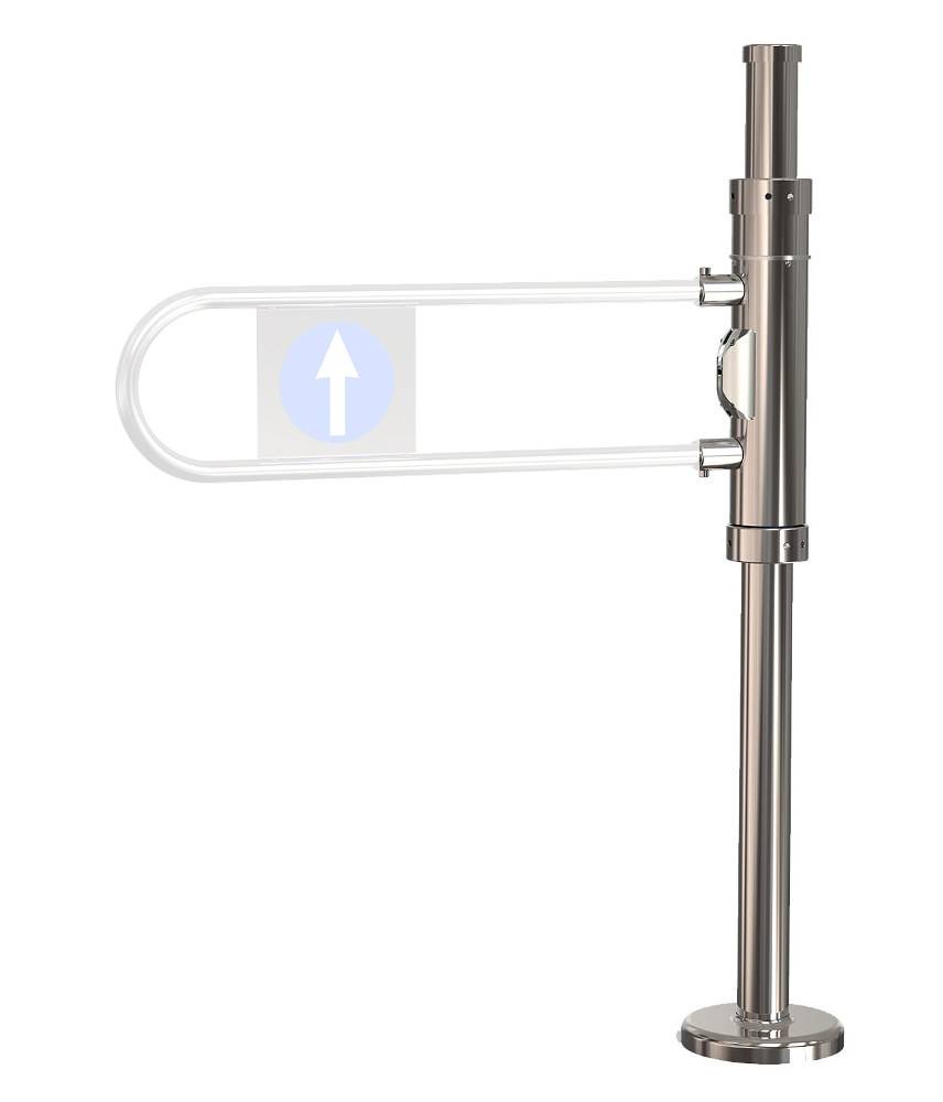 Дуга 4 вращается вместе с поворотным механизмом 2 вокруг вертикальной оси стойки 1 и под действием пружины устанавливается в положение перекрытия прохода. При необходимости дуга калитки может быть зафиксирована как в положении перекрытия прохода, так и в положении свободного прохода с помощью двух замков-стопоров 7, управляемых клавишами, расположенных на поворотном механизме со стороны дуги.