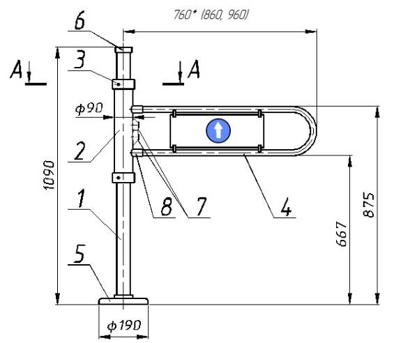 Калитка «Ростов-Дон К10» состоит из стойки 1, на которой смонтирован поворотный механизм 2, кольца верхнее и нижнее 3. Кольца 3 зафиксированы тремя установочными винтами М8х8 под углом 120° (Приложение 2 поз. 9); эти места для стыковки с ограждениями использовать нельзя. С поворотным механизмом соединена дуга 4, которая служит для перекрытия прохода. В нижней части стойки 1 расположен кожух 5, под которым находится фланец для крепления калитки к полу. Вверху стойки калиток закрыты крышкой 6.