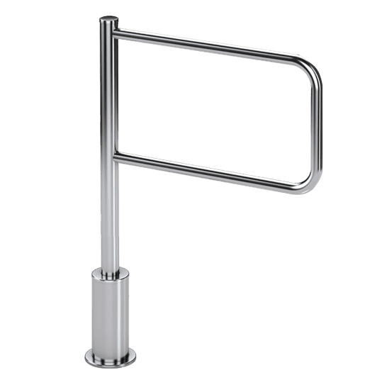 Все элементы конструкции калитки выполнены из шлифованной нержавеющей стали. Створка калитки крепится к стойке при помощи установочных винтов. Стойка вращается относительно неподвижного основания, прикрепленного к полу. Крепление к полу скрывает крышка основания.