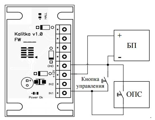 Схема подключения блока питания (БП), кнопки управления и охранно-пожарной сигнализации (ОПС) к плате калитки показана на рисунке. Плата калитки расположена в ее основании.