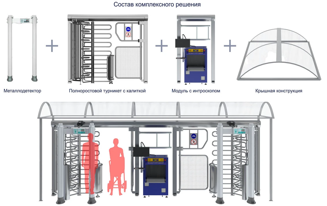 Для обеспечения наибольшей безопасности на проходной рекомендуем использовать комплекс из нескольких полноростовых турникетов и модуля для установки РТУ, металлодетекторов, рентгенотелевизионных установок под навесом. Металлодетектор обеспечивает контроль проноса металлических предметов проходящих через него людей. Стационарная рентгеновская установка предназначена для досмотра личных вещей и обследования отдельных предметов (посылок, бандеролей, ручной клади и т. п.) с целью обнаружения в них незаконных вложений, таких как: взрывные устройства, холодное и огнестрельное оружие и другие запрещённые к провозу предметы