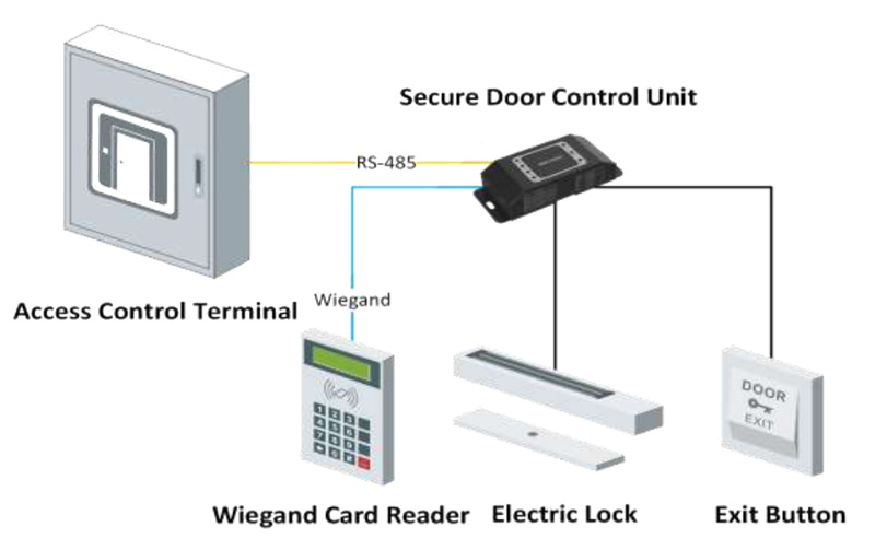 • Принимает сигнал электромагнитного замка, сигнал кнопки выхода и сигнал датчика контроля вскрытия и отправляет их на терминал контроля доступа
